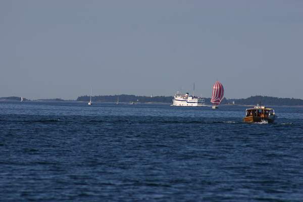 Kesän 2006 purjehduskuvia Räfsötä kohti koneella ajaessani satuin puolihuolimattomasti vilkaisemaan olkani yli ja huomasin yllättäen Kristina Reginan hiipineen aivan taakseni ilman mitään merkkejä. Ehdin ajaa pois alta reitiltä n. 20 metriä kun laiva ohitti. Eihän tuo nyt mikään jättiläinen ole, mutta kyllä siinä vähän sai aaltoa hämmästellä ja sitä, ettei ollut alle sadan metrin päähän ehdittyään antanut mitään äänimerkkejä - lienee suunnitelmissa töräyttää juuri takanani kovaa ja korkealta ja katsoa miten sitloora täyttyy eritteistä pelästyessäni. Sama laiva tuli vielä näkymään lomapurjehduksellani usein.