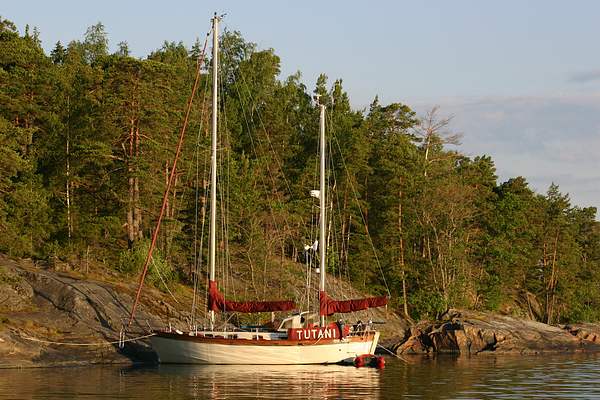 Kesän 2006 purjehduskuvia S/Y Tutani aamuauringon kajossa. Tämän veneen miehistö auttoi minua rantautumisessa. Tutanin keulasta vasemmalle on Byxholmenin itselämmitettävä sauna, jossa löylyt ovat ihan kelvolliset. Matkani jatkui kohti Hankoa taas melkein tyynessä kelissä puoli kahdeksan aikaan.