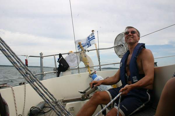 Kesän 2006 purjehduskuvia Miehistönvaihto takana. Nauvossa vietin pari päivää ja nautin rantaravintoloiden annista. Nauvossa koin myös tämän reissun ainoan sadekuuron - se olikin melkoinen ukkospuuska, satoi todella kovaa n. parinkymmenen minuutin ajan, ukkonen jyrisi ja salamat iskivät hyvinkin tiheään - sää viileni huomattavasti tämän jälkeen, samoin tuulet voimistuivat ja kääntyivät vähitellen pohjoisiksi matkan edetessä. Tässä uusi miehistön jäsen ottaa tuntumaa purjehtimiseen Korppoon pohjoispuolella.