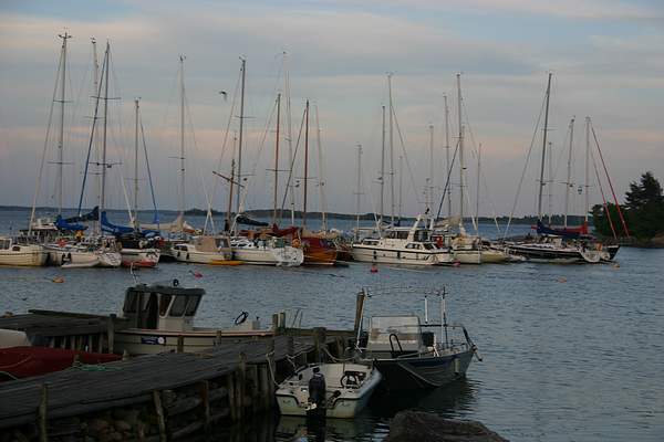 Kesän 2006 purjehduskuvia Lappon laituri oli aika pitkä ja sen poijut ovat kaukana laiturista. Laiturin pohjoinen puoli oli aika tiukkaan täynnä veneitä, jotka olivat kiristäneet köydet niin tiukoiksi, ettei poijuja näkynyt vedenpinnalla lainkaan - pakko siis kiinnittyä etelänpuolelle - tuulen puhaltaessa aika kovaa takaapäin. Kiinnittyminen menikin melkoiseksi showksi. Ensin en saanut poijukoukkua kiinni ja piti peruutta takaisin vastatuuleen - viereisestä Nauticatista ohjeet olivat: älä kolhi venettäni... Lopulta saimme tuskaisen vääntämisen jälkeen veneen kiinni. Ja tovin kulutua kuvassa näkyvästä isosta moottoriveneestä kuului ohjeita, että ensi kerralla sopii tulla vähän paremmin satamaan - tällä kertaa kuitenkin viesti oli huumorimielessä. Vene oli yllättäen entisen työkaverini Aki, joka oli jäähyväisreissulla omalla kulkupelillään. He olivat samalla reissulla olleet Jungfruskärissä ja siellä naapuriveneestä oli tehty ostotarjous, josta kaverini ei kieltäytynyt. Vene siis oli viimeistä viikonloppua käytössä ja suunta olikin kohti Turkua ja tavaroiden tyhjennystä ennen luovutusta uudelle omistajalleen. Suomi on pieni maa...