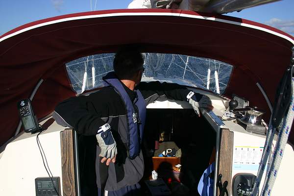 Kesän 2006 purjehduskuvia Markku kävi välillä kurkkaamassa Joonasta joka veti autaana hirsiä keupapunkassa. Pyysin häntä parkkeeraamaan itsensä portaille ja pitämään kiinni kajuutan aukon reunoista - näin pystyin itse paremmin keskittymään nousevaan tuuleen ja aallokkoon. Käytännössä keli ei ollut vielä paha, mutta kun siihen ei ollut tottunut, oli hieman harjoiteltavaa senkin osalta. Molemmat olivat tyytyväisiä, Markku ei enää kastunut roiskeilta ja oli tuulensuojassa melko lämpimässäkin. Kannella oli tuulessa aika viileää ja kosteatkin oltavat.