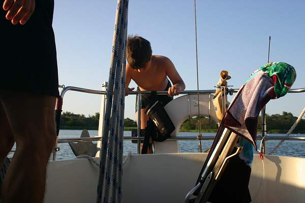 Kesän 2006 purjehduskuvia Joonas löi vetoa, että käy aamutuimaan ennen lähtöä uimassa veneen perästä. Lähtö oli seitsemän aikaan - joka oli TODELLA aikaista hänen päivärytmissään. Markku kävi vihjaisemassa, että lähdemme tuota pikaa ja seurauksena kaveri oli vilauksena partaan toisella puolen...