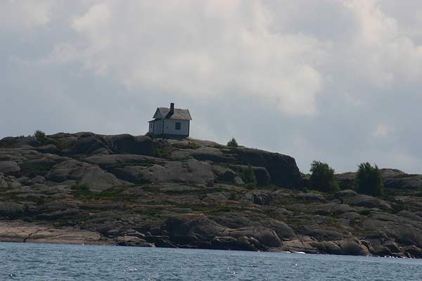 Kökarin luotsiasema. Karlbyn kyläsatamaan ajettaessa tämä on tärkeä maamerkki. Reitti kallioluotojen välistä kulkee tämän etupuolelta vasemmalle..