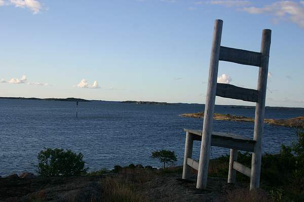 Trunsön tunnusmerkkinä oleva puhelinpylväistä tai vastaavista tukeista kyhätty tuoli.