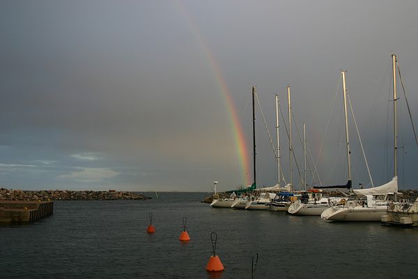 Sateenkaaren päässä on purjevene.