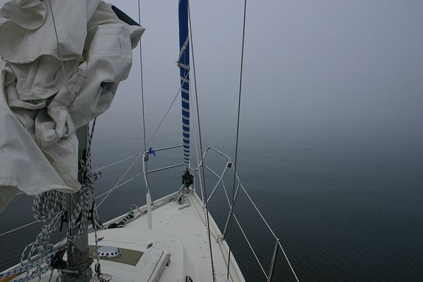 Kesän 2006 purjehduskuvia Sumun myötä lakkasi tuuli ja laskin purjeet takaisin alas. Käynnistin koneen ja ajoin varovasti kohti pohjoista. Sammutin aina välillä koneen ja kuuntelin veden halki liukuessani ääniä ympäriltä, kuulin vain kohinaa vasemmalta ja oikealta heikon merenkäynnin loiskiessa rantoihin väylän molennin puolin. Ei muita sumutorvia saati veneilyn ääniä mistään. Aika uskomaton kokemus kaikkinensa.