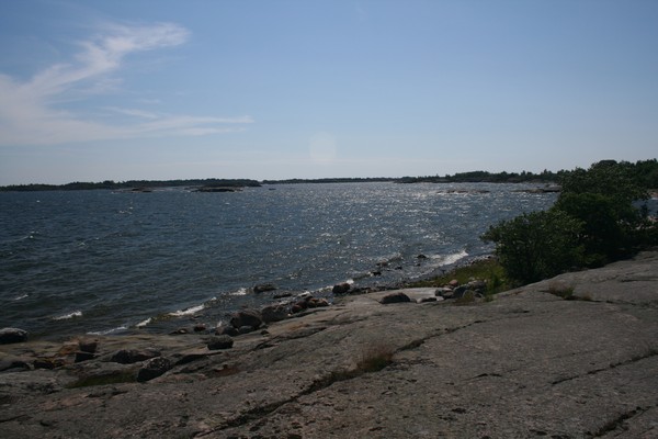 Vänön satamaan ajetaan kuvassa näkyvien luotojen takaa, melko piilossa olevia linjatauluja seuraten.