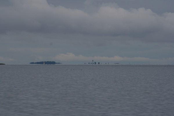 Kesän 2007 purjehduskuvia Flisösundin jälkeen avautui Ledfjärden, jonka eteläpään saaret näyttivät kelluvan ilmassa. Reitti kulki kuvan oikeaan kulmaan. Käytännössä merimerkkejä ei tältä etäisyydeltä nähnyt lainkaan, piti vain suunnata kohti kompassisuunnan ja plotterin suosiollisella avustuksella. Muista veneistäkään ei ollut apua - meri oli tyhjä.