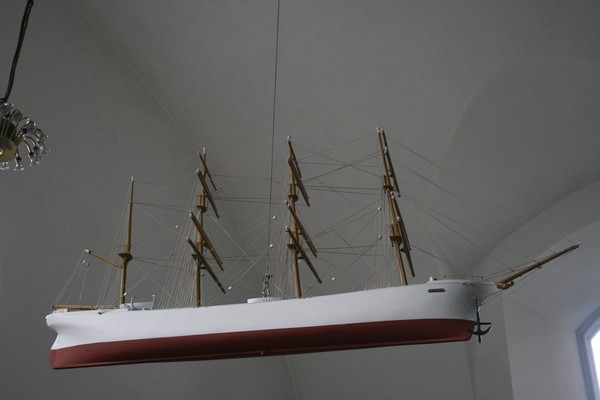 Hieman uudemmantyylinen votiivilaiva Jomalan kirkossa.