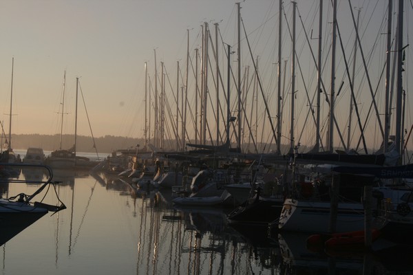 Satama nukkui tuulettomassa aamussa.