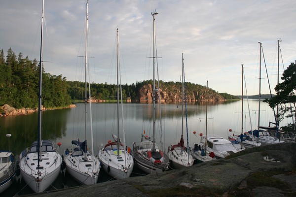 Kesän 2007 purjehduskuvia Bomarsundin laituri täyttyi aika hyvin iltaan mennessä. Meidän viereemme tuli neljä kaverusta meitä pienemmällä purrella, luultavasti partiolaisia. Jäimme poijuun näin kahden veneen väliin. Kun sanoin heille, että lähtisimme aamutuimaan, se oli heille ok - sen kun herättäisimme heidät... tässä ennen lähtöä koko satama nukkui autuaan unta vielä.