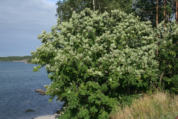 Navakka ja puuskainen tuuli käänsi rannan pihlajan lehdet ympäri.