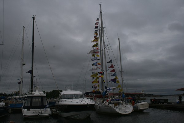 Kesän 2007 purjehduskuvia Pääsin Hankoon ihan kohtuullisesti vaikkakin märkänä pärskeistä kuoppaisella merellä. Käännyttyäni Tulliniemen ohi aallot kasvoivat huomattavasti tuulen päästessä puhaltamaan vielä estottomammin etelästä. Satama oli täynnä - viimeinen Itä-Sataman vapaa paikka meni nenän edestä, mutta saaren satamaan mahtui vielä. Satamaa täyttivät paitsi perushuviveneilijät, myös Tall Ship Racen veneet, kuten tässä tuo liputettu.