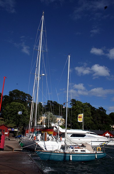 Kesän 2008 purjehduskuvia Länsisatamaan tuuli niin paljon, että ponttonilaituri, jolla seison kuvaa ottaessani, keikkui niin, etten meinannut pysyä pystyssä. Tuohon sinertävään veneeseen ei päässyt sisään, eikä sieltä pois, sen keula nousi ja laski niin voimakkaasti. Takana saksalainen superjahti Vita Bella, 81,86 jalkaa.. ei keinunut aallokossa juurikaan (60 tonnin painolla oli erittäinkin hyvä aallonmurtaja)