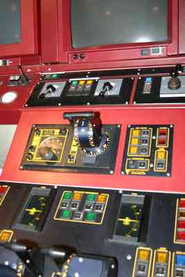 Silja Linen komentosillan ohjauslaitteita simulaattorissa.