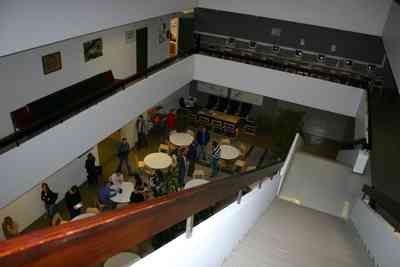 | Solmuja | Veneilyn turvallisuuskoulutus Merenkulkuopiston keskellä oli suhteellisen iso valopiha. Luokkahuoneita on rajoitetusti joten mikroluokka on käytävällä - tuossa toisessa keroksessa vastapäätä.. alhaalla on alkamassa lounastunti.
