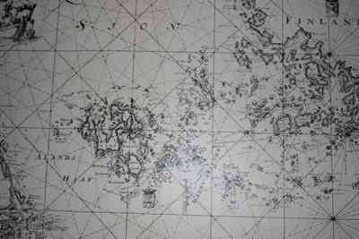 Vanhojen merikarttojen kopioita oli yhdellä opiston seinällä, tässä Saaristomerta ja Ahvenanmaata.
