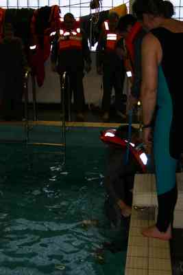Veneilyn turvallisuuskoulutus Veteen joutuneen saa yllättävän kätevästi ylös vedestä köyden avulla. Köysi pujotetaan käsien alta ja selän takaa ja sitten vain kiskomaan.. Nostettava kannattaa pitää rinta parrasta vasten - taittuu luonnollisesti oikein veneen sisään murtamatta selkäänsä..