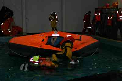 Pelastuslautan reunan yli kapuaminen oli vielä raskaampaa, tekniikkalaji - onneksi lautan kyljessä roikkuu apuna köysitikkaan tapaiset.