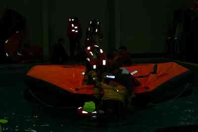 Pelastuslauttaan pyrkijöitä.. tässä näkee hyvin mikä merkitys heijastimilla asussa on.