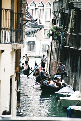 Liikenneruuhka Veneziassa.. kanaalin täydeltä gondoleita...