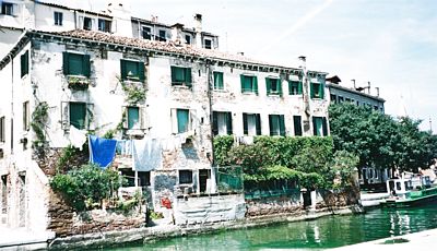 La Serenissima, Venezia.. Giardinon takana telakalle päin kuljettaessa aukeaa täysin erilainen Venezia kuin lähellä Canal Grandea kulkevan silmissä näkyy. Rakennukset ovat toinen toistaan huonommassa kunnossa ja rapautuvat koko ajan ilman saasteiden ja kosteuden, jatkuvien tulvien vuoksi aina vain huonompaan kuntoon.. Silti täälläkin asutaan sitkeästi.