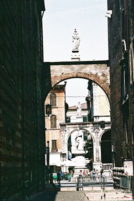 Verona Ratsastajapatsaan jätettyäni käännyin kadunkulmasta oikealle ja olin taas tulossa Danten patsaalle - nyt hauskassta kuvakulmasta jossa näkyy kolme ihmisfiguuria suorassa linjassa Danten ollessa hallitsevassa roolissa aukion keskelle sijoitettuna. Ennen aukiolle saapumista tätä reittiä kuljettaessa tulee kaivannolle, jossa näkee kaupungin vanhan pohjan arkeologien jäljiltä kaivettuna. Veronassa on näitä vanhan kaupungin pohjia kaivettu auki muutamaan muuhunkin kohtaan.