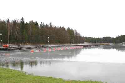Sarvastonlahtea, syvänveden raja - ja samalla penkereen reuna - näkyy veden väreilystä. Heikko jääkerros on noussut myös veden mukana ylöspäin.